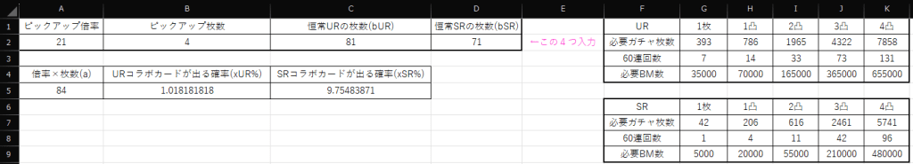 今までコラボガチャの必要枚数や必要BMはいちいち全て計算していたが、今更ながらすごく面倒に感じたためエクセルにて作成することにした。早くすればよかった。