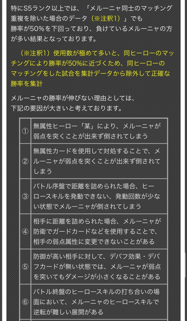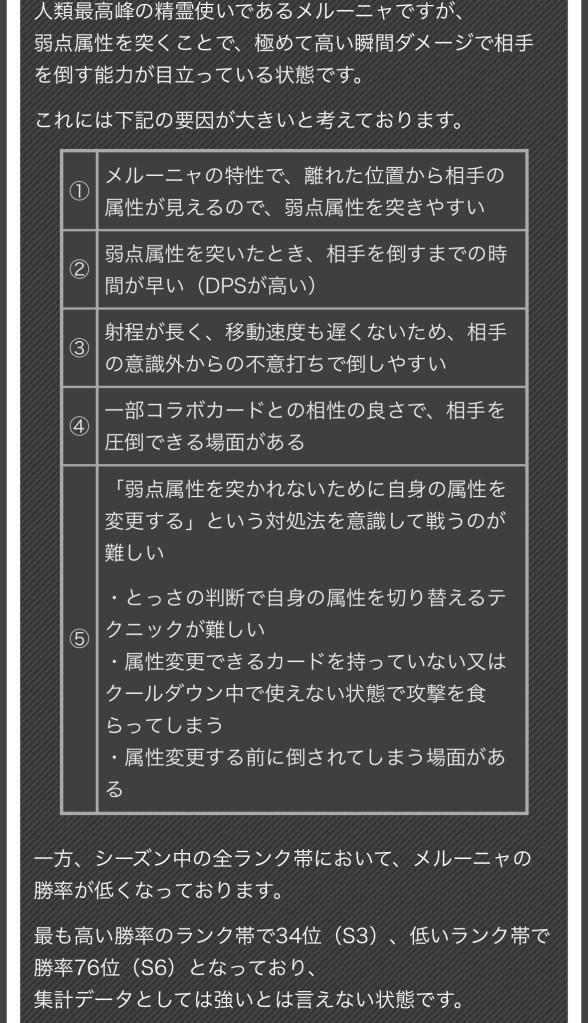 ここでやっとタイトル回収だが、運営はメルーニャが大暴れしていた根本の原因から目を背けていないだろうか?そう、強いのはメルーニャではなく「万全」という凶悪カードなのである。