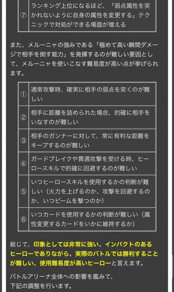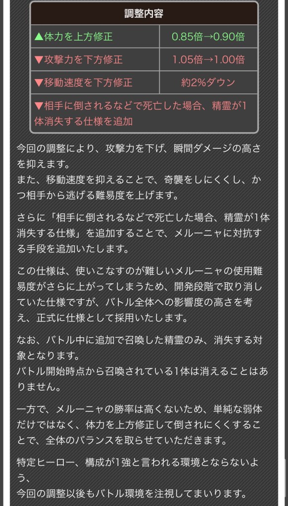 2025/11/25に、あまりにも使用率が高かったメルーニャを中心としたキャラ調整が行われた。内容を見ていこう。